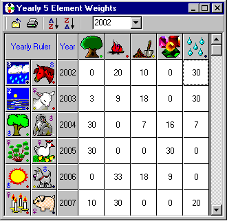 The Yearly Five Element Weights lists 100 years of Five Element scores from the selected Year.