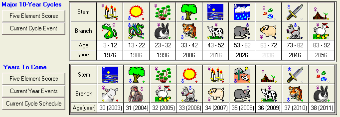 Chinese Fortune Angel - Find Lucky ElementThe complete Birth Chart is shown during finding the Lucky Element. Years-to-come Stem-Branch cycle chart is added. Also, the Age information is shown in the charts.